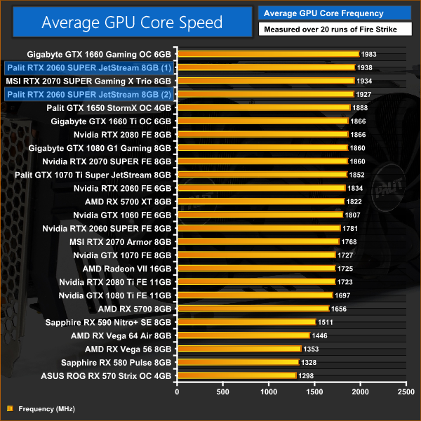 For these next tests, we tested both the primary BIOS 1, as well as the secondary BIOS. There isn't much between them, with the primary BIOS averaging 1938MHz under load – or just 11MHz more than the secondary BIOS. This puts the Palit card around 160MHz faster than the Founders Edition 2060 SUPER based on our real world testing.