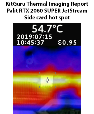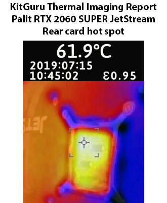 These thermal images were taken using BIOS 1, and there's no areas of concern for the card. The hot spot on the rear is directly behind the GPU core, as expected, but this didn't exceed 62C which is still a great result.