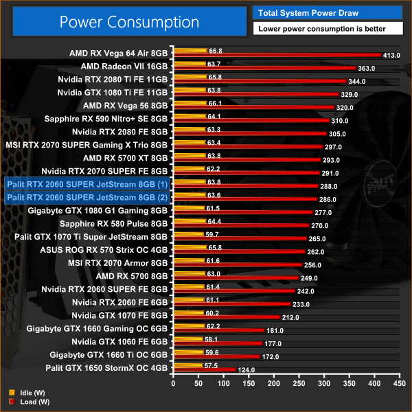 Power consumption for both BIOS is very similar, and is significantly increased over the 2060 SUPER Founders Edition, with the Palit pulling 44-46W more at the wall. This puts it in RTX 2070 SUPER territory, and this is clearly the downside to Palit disregarding the power limit in favour of higher clock speeds. It's not a major issue for me at all, as an extra 45W or so will do very little to my power bill – but it does depend where you live and how much you pay for your electricity.