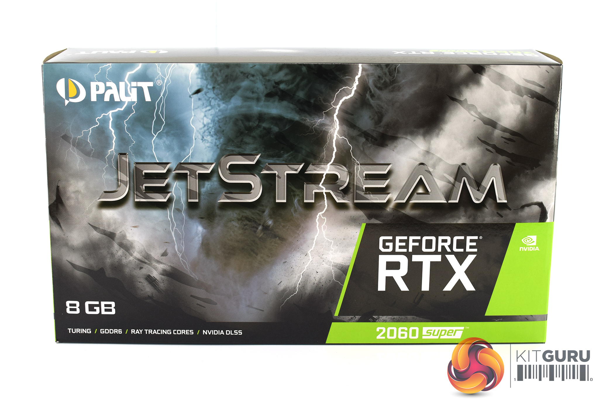 The Palit RTX 2060 SUPER JetStream ships in a compact box, with the entire front taken up by an eye-catching lightning storm design, though there's no image of the card itself visible on the front.