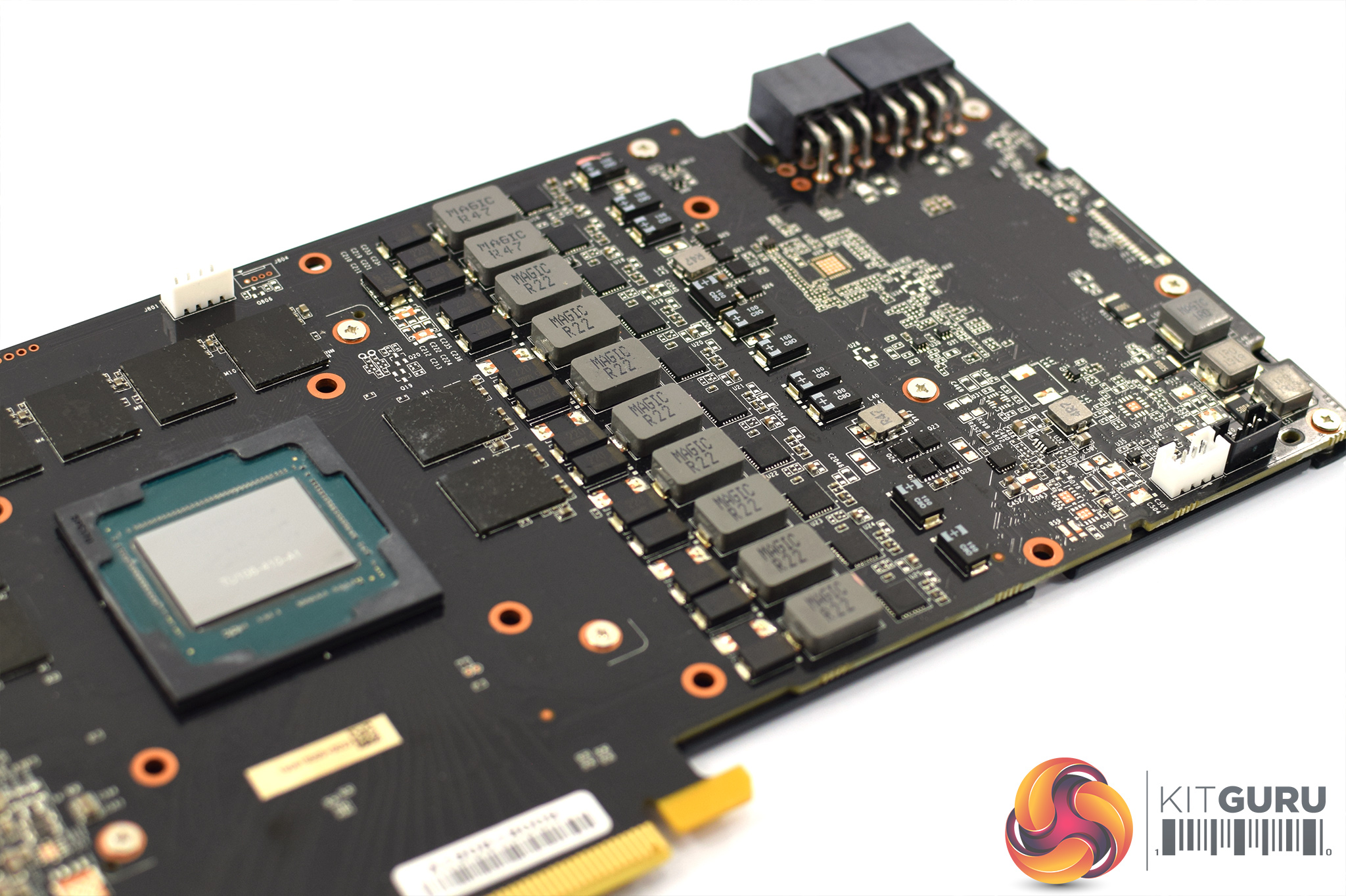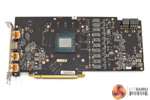 8 screws need to be removed from the back of the card to remove the cooler, and then we get access to the PCB. As far as I can tell, Palit is re-using its RTX 2070 GameRock Premium PCB design for this card, and that is certainly a good thing as its power delivery has been beefed up to an 8+2 phase configuration, where the Founders Edition has a 6+2 design.