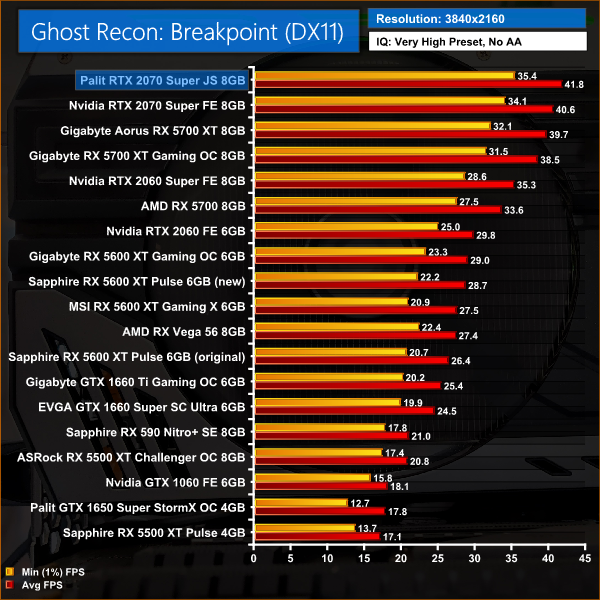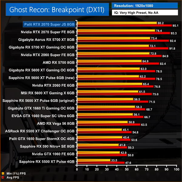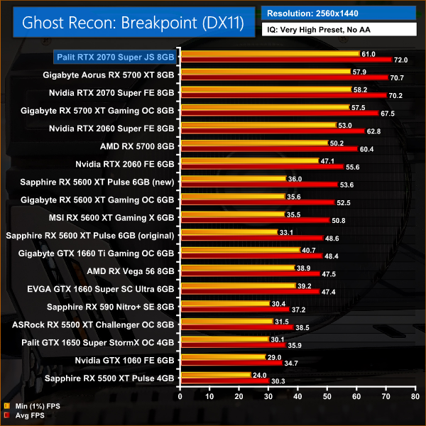 Moving onto Ghost Recon: Breakpoint, at 1440p we see the Palit JS come in 3% faster on average than Nvidia's Founders Edition. The card also holds leads over both the Gaming OC and the Aorus RX 5700 XTs in this title.