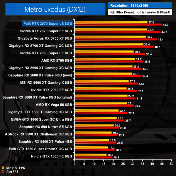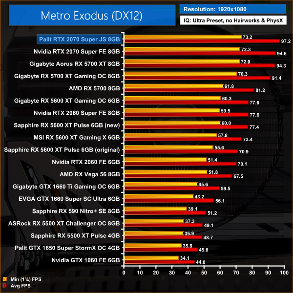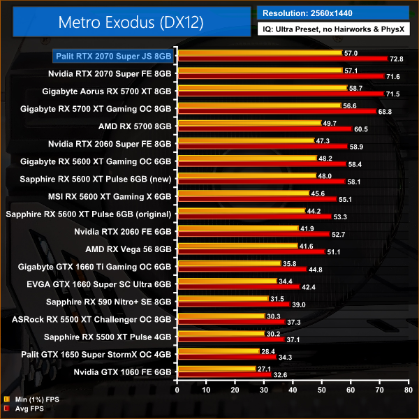 Metro Exodus follows a similar trend to many other games we have looked at today, with the Palit JS coming in 2% faster than the Founders Edition 2070 Super at 1440p. Compared to the Aorus RX 5700 XT, however, the difference is still just 2% in Palit's favour.