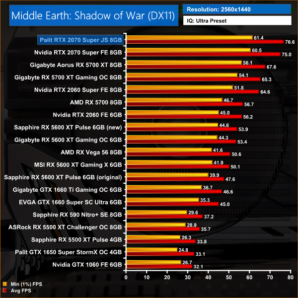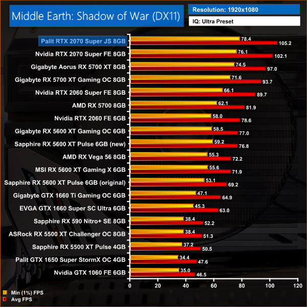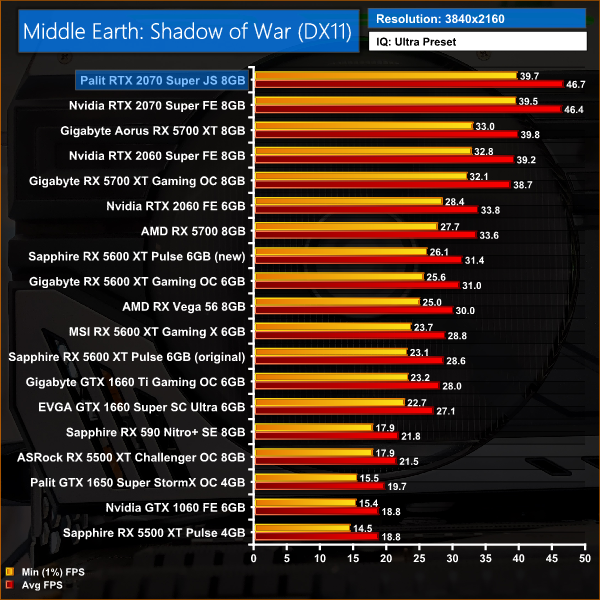 Nvidia clearly has the upper hand in this title – at 1440p, the Palit JS is 17% faster than Gigabyte's Gaming OC RX 5700 XT, and that lead stretches to 21% at 4K. Even the Aorus 5700 XT is still significantly slower.