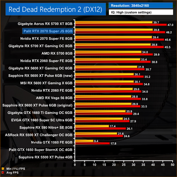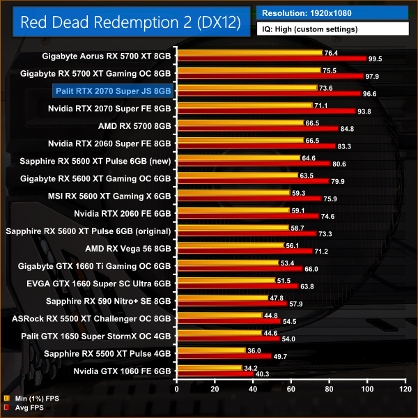 As for Red Dead Redemption 2, this is one of the few titles where the Palit JS 2070 Super is slower than the Gigabyte RX 5700 XT Gaming OC – at 1440p, for instance, the Palit is 1% slower, and 3% slower than the Aorus.