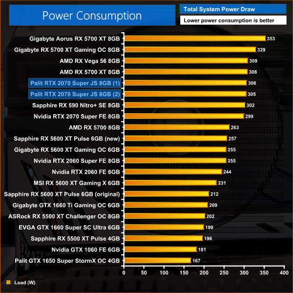 Finally, looking at power draw there is very little between all three 2070 Super results on our chart, with BIOS 1 and BIOS 2 pulling just over 300W at the wall.