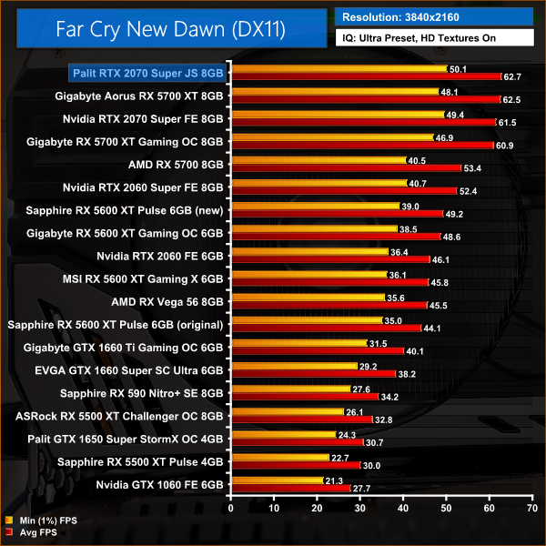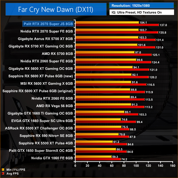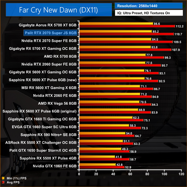 Far Cry New Dawn is another title where there is very little to split between the 2070 Super and RX 5700 XT. At 1440p, the Palit JetStream is just 3% faster than Gigabyte's Gaming OC model, while it's 1% faster than the Founders Edition 2070 Super.