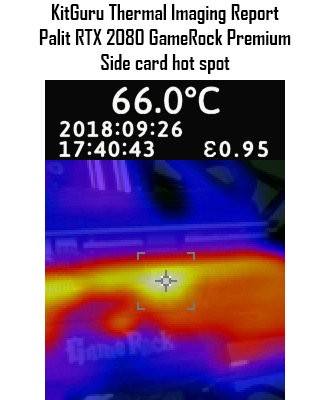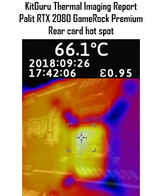Considering the GPU core only peaked at 66C, it is no surprise to see excellent results from our thermal gun. The side of the card peaked at 66C exactly, and this was on an area of the aluminium fin array just above the GameRock logo. The rear of the card peaked at 66.1C which was unsurprisingly directly behind the GPU core. Both results are fantastic.