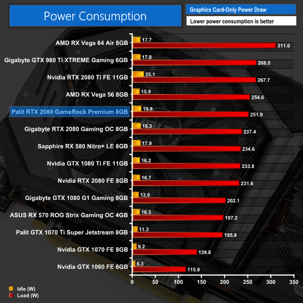 Not surprisingly given its clock speed advantage, the GameRock Premium pulls more power than the Gigabyte RTX 2080 Gaming OC – but an extra 15W or so is going to make very little difference in the real world.