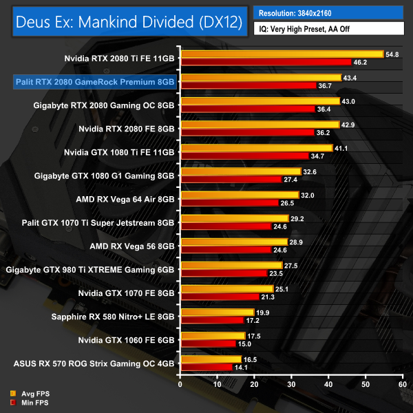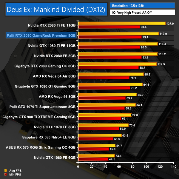Our first game – Deus Ex: Mankind Divided – shows the Palit card enjoying a lead of between 1-2FPS when compared with the Gigabyte RTX 2080 Gaming OC.