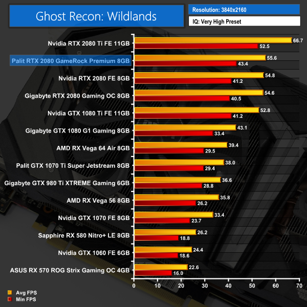 Ghost Recon Wildlands continues this trend – the Palit is 0.8 FPS faster at 4K than Nvidia's Founders Edition RTX 2080, while Gigabyte's RTX 2080 is only 0.2FPS behind that.