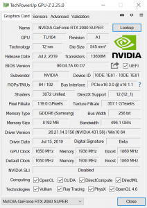 On top of that, while there is still 8GB GDDR6 memory as per vanilla RTX 080, 2080 SUPER has memory modules rated at 15.5Gbps, up from 14Gbps from the card's predecessor. Total graphics power is rated at 250W, which is the same as the Founders Edition.