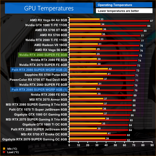 BIOS 2 did run slightly hotter, with higher idle temperatures as well due to the fan-stop mode which is only available on that secondary BIOS, but under load it is still 3C cooler than Founders.