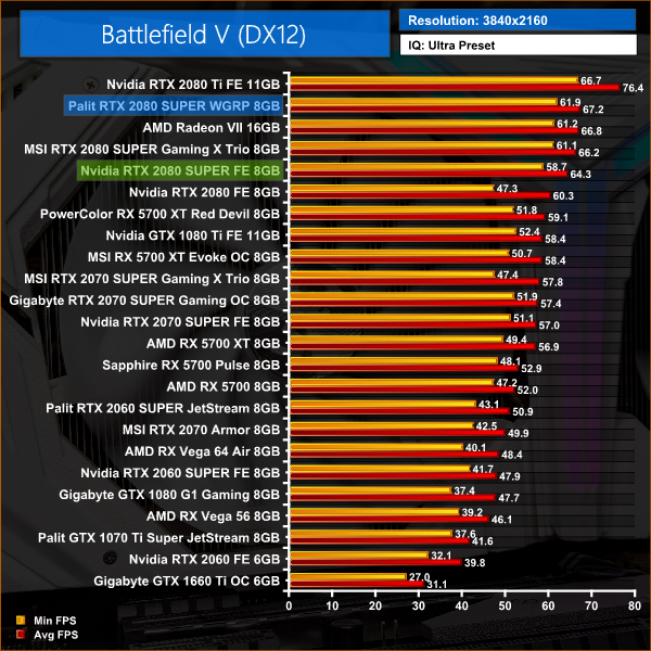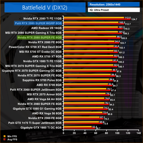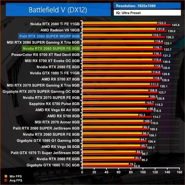Battlefield V is our first game of the day, and it is actually the title which shows the biggest improvement for the Palit WGRP over the Founders Edition – with Palit's card coming in, on average, 5% faster.