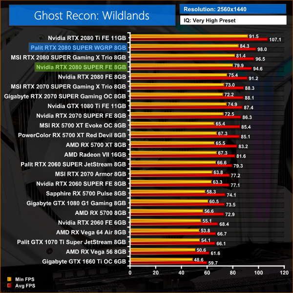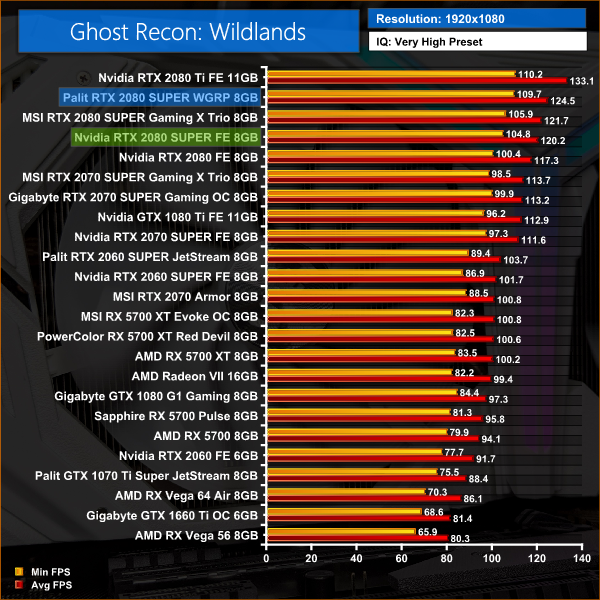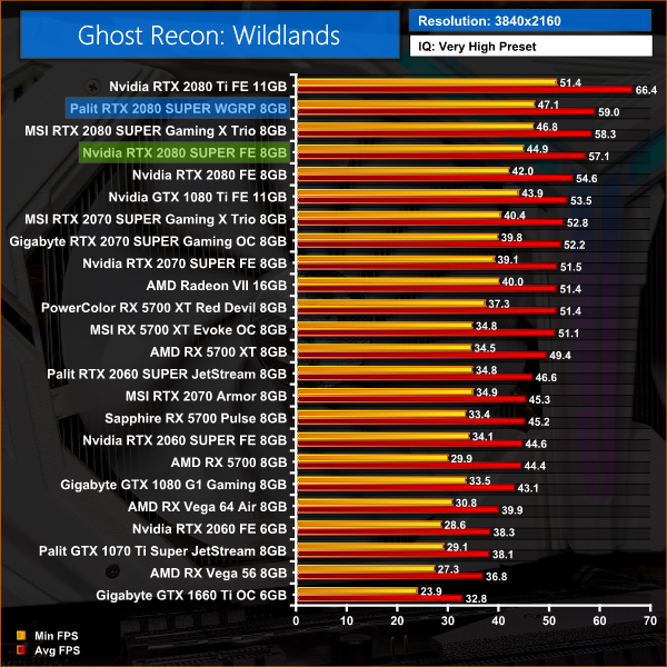 Things pick up slightly with Ghost Recon: Wildlands, with our Palit card coming in 3% faster than the Founders Edition, but it's still neck-and-neck with the MSI Gaming X Trio.