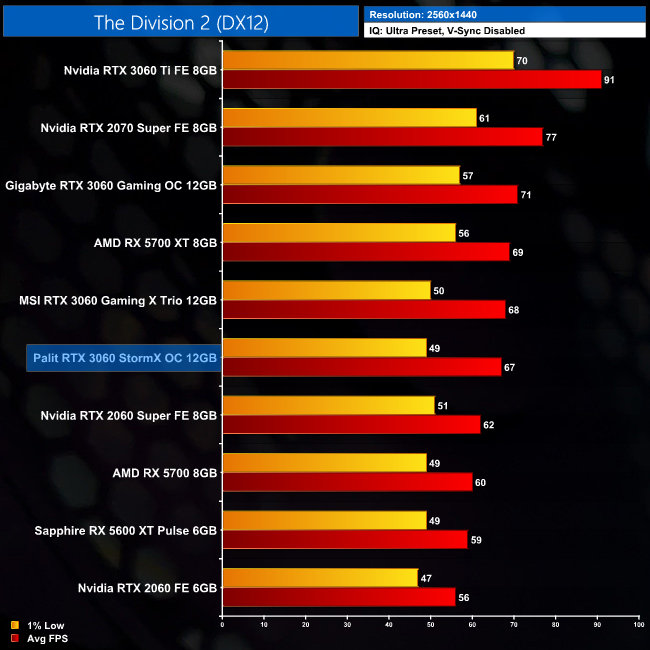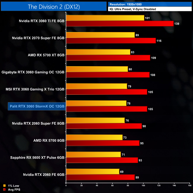 In The Division 2, we see all three RTX 3060s averaging over 100FPS, so that's a very smooth experience at 1080p. The Palit StormX OC is outperforming the previous-gen RTX 2060 by 18% here.