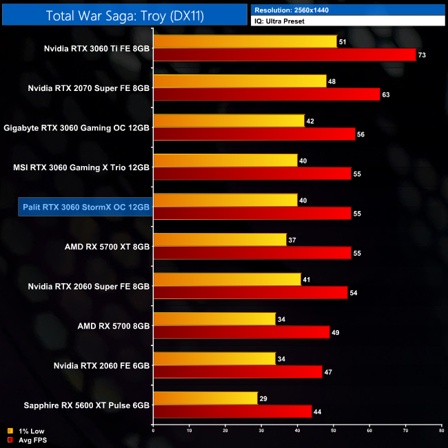 The latest Total War title sees the Palit StormX OC averaged just under 80FPS, so it's effectively on par with the Gaming X Trio. Relative gains compared to the RTX 2060 are more limited however, at just 13%.