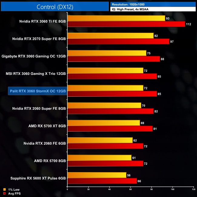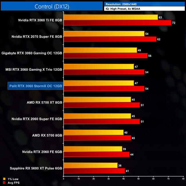 Next we have Control, and here the StormX OC is faster than the RX 5700 XT by 4FPS, but do remember this is an Nvidia-sponsored title. Against the RTX 2060, we're looking at an 18% gen-on-gen boost here.