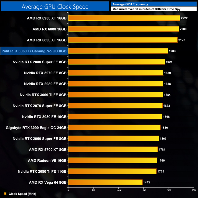 Here we present the average clock speed for each graphics card while running the 3DMark Time Spy stress test for 30 minutes. We use GPU-Z to record the GPU core frequency during the Time Spy runs. We calculate the average core frequency during the 30 minute run to present here.
