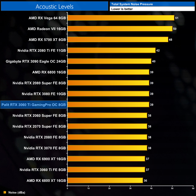 We take our noise measurements with the sound meter positioned 1 foot from the graphics card. I measured the noise floor to be 32 dBA, thus anything above this level can be attributed to the graphics cards. The power supply is passive for the entire power output range we tested all graphics cards in, while all CPU and system fans were disabled. A reading under load comes from running the 3DMark Time Spy stress test for 30 minutes.