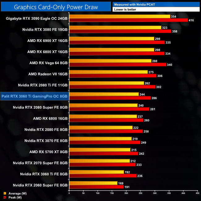 We also use Nvidia PCAT to measure power draw of the graphics card only, with readings from both the PCIe slot and the PCIe power cables combined into a single figure. This provides us with significantly more accurate data to work with as it is measuring only the GPU power, and not total system power which is a fundamentally imprecise measurement.
