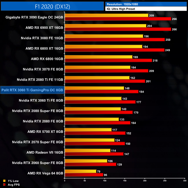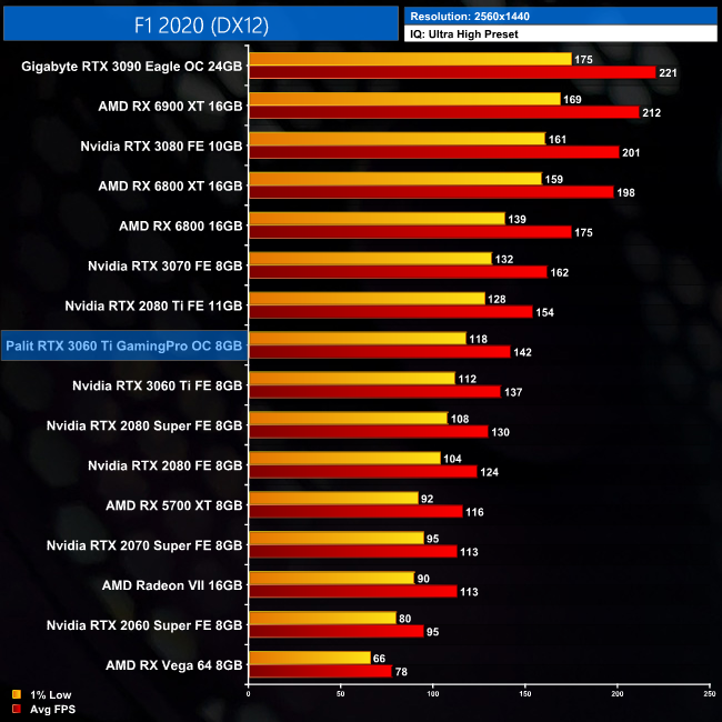 Next up is F1 2020, and this game sees the GamingPro OC average 142FPS at 1440p resolution. This is a lead of 5FPS compared to the Founders Edition, or another 4% difference in Palit's favour.