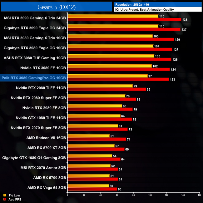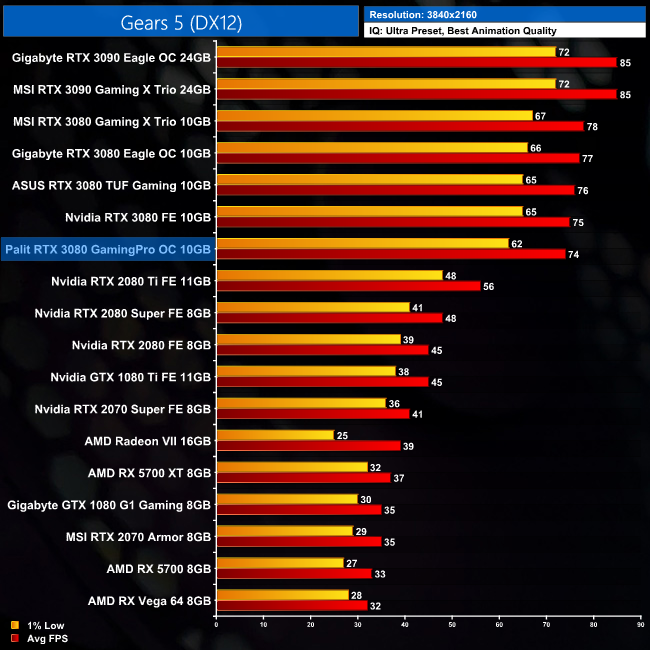 It's more of the same in Gears 5. The Palit GamingPro OC is 1% slower than the Founders Edition at every resolution we tested, but that means it is still 32% faster than the RTX 2080 Ti at 4K.