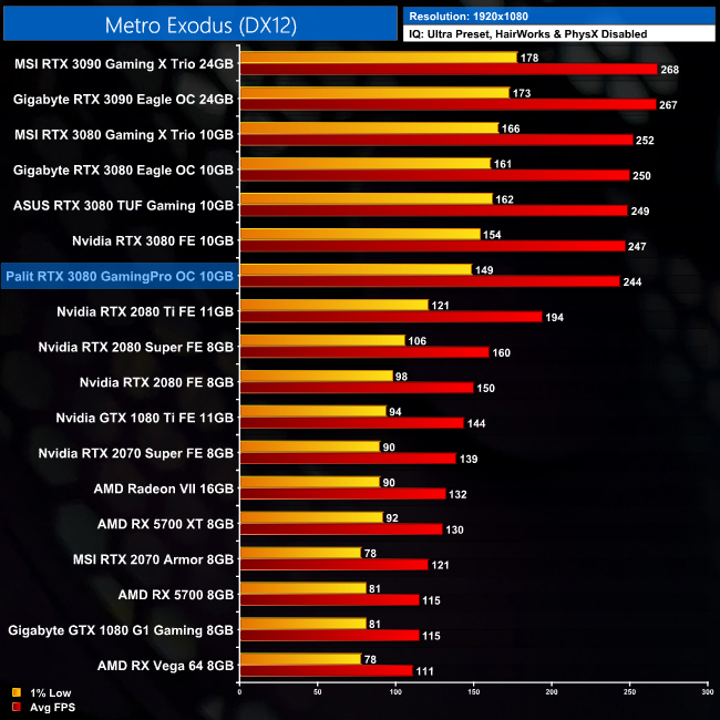 The Palit RTX 3080 GamingPro OC also edges out the Founders Edition by a single frame in Metro Exodus, when tested at 4K. That puts it 31% ahead of the RTX 2080 Ti.