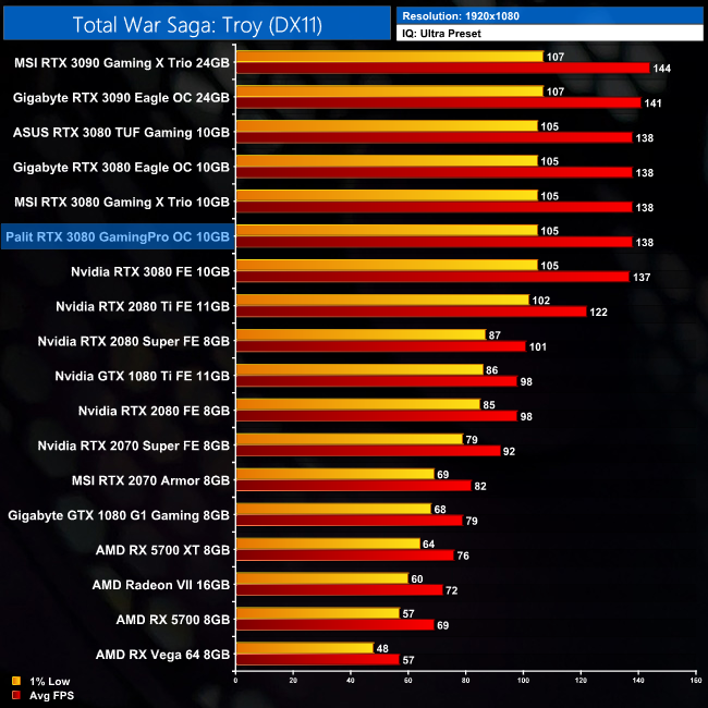 Our final game of the day is Total War Saga: Troy, and this is pretty typical of our testing today – the GamingPro OC is just a single frame slower than the RTX 3080 Founders Edition at 4K.