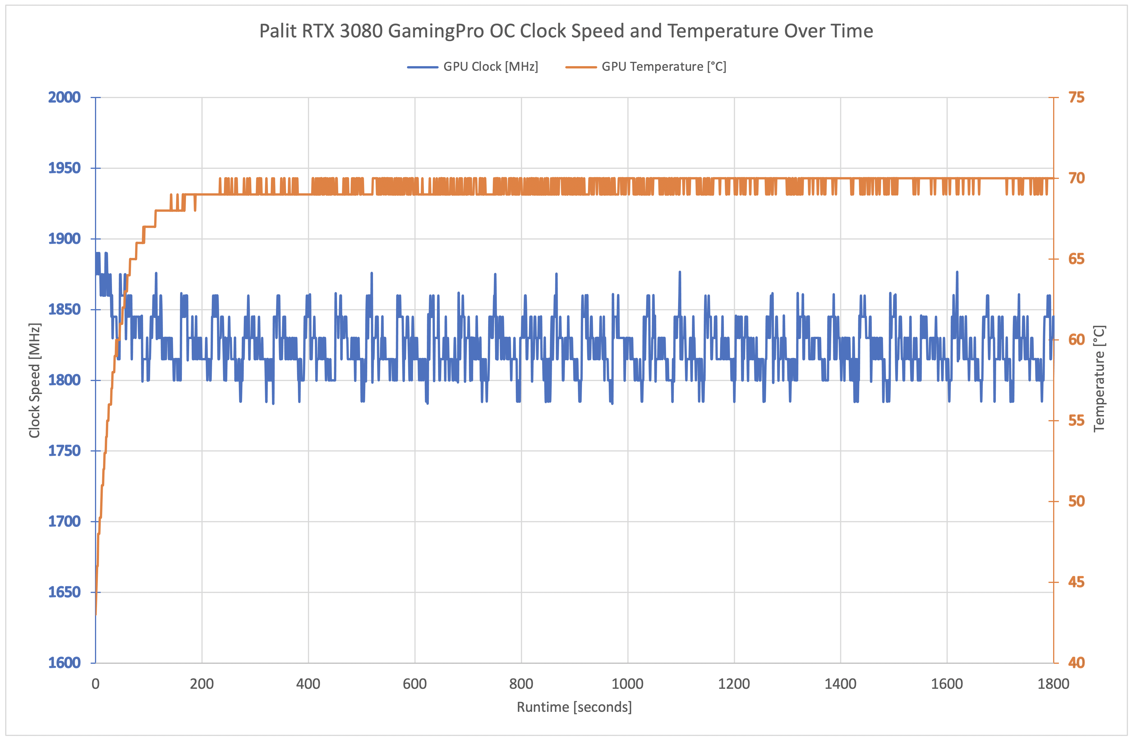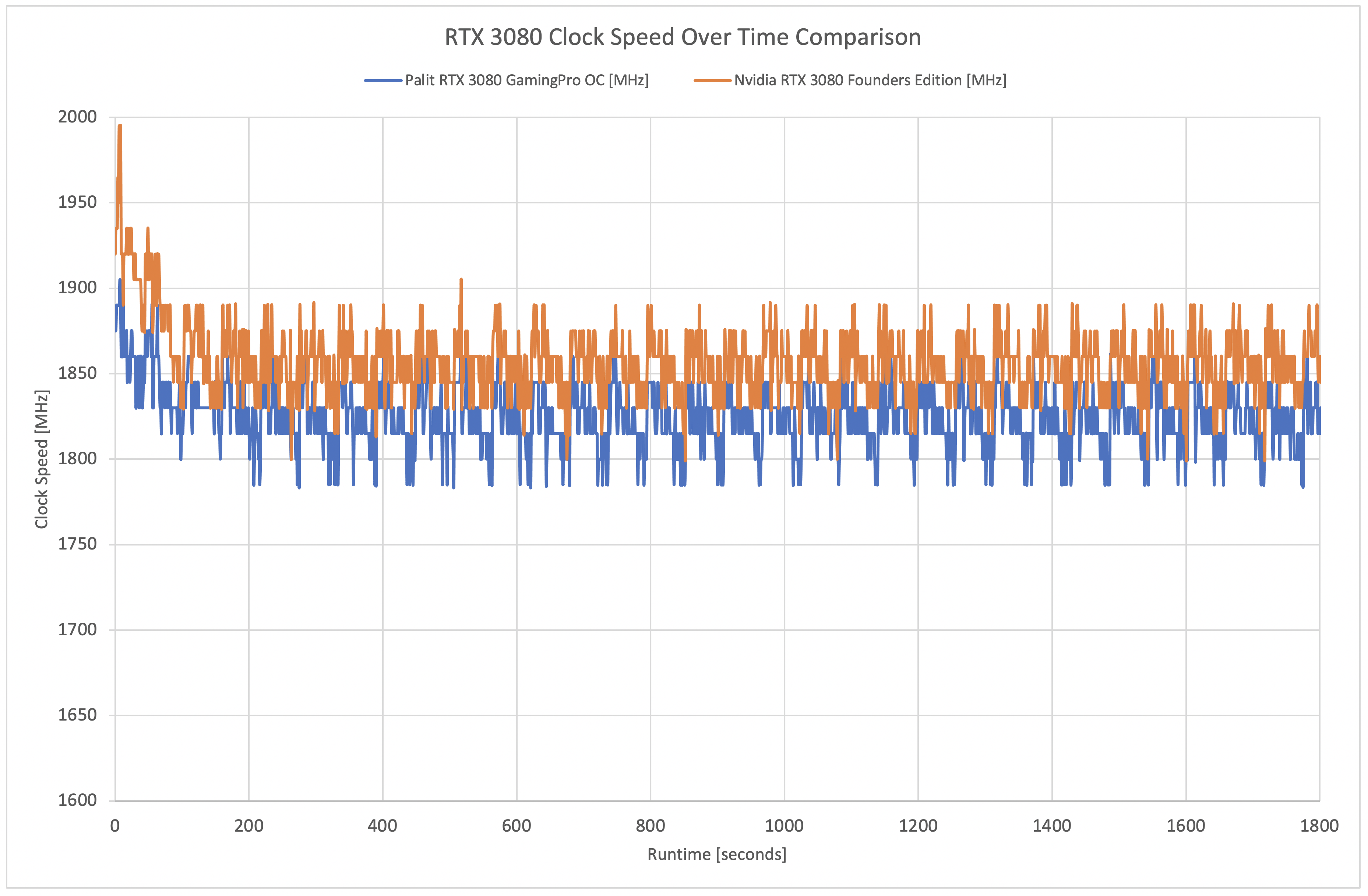 Despite having a rated boost clock of 1740MHz, which is 30MHz above stock clocks, in the real world the card averaged 1825MHz, which is about 30MHz slower than the Founders Edition. We can see in our second scatter graph, where we compare the clock speed behaviour over 30 minutes for both the Palit and Nvidia Founders Edition, that the Nvidia card is consistently running at higher speeds.