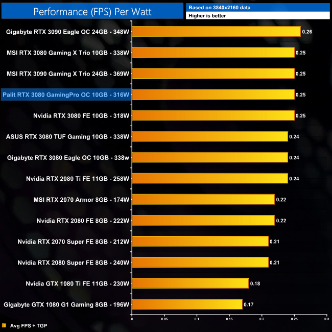 With power draw and performance pretty much equal between the GamingPro OC and the Founders Edition, it's no surprise to see performance per Watt is also a tie between the two. This means the GamingPro OC does deliver fractionally better performance efficiency compared to the TUF Gaming or Gigabyte Eagle OC, but we're talking the smallest of margins here.