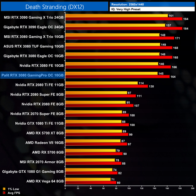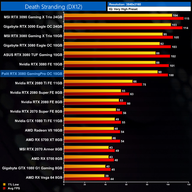 Death Stranding sees the RTX 3080 GamingPro OC average 100FPS at 4K, just 1FPS behind the Founders Edition. This puts the Palit GPU 33% ahead of the RTX 2080 Ti.