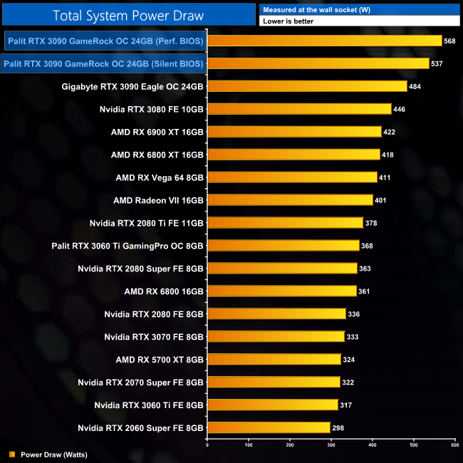 Total system power draw is high, hitting almost 570W under load when using the Performance BIOS.