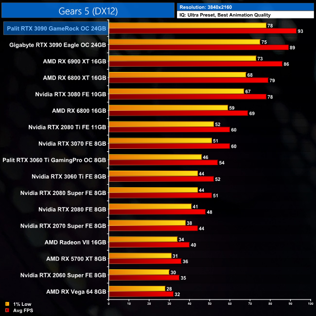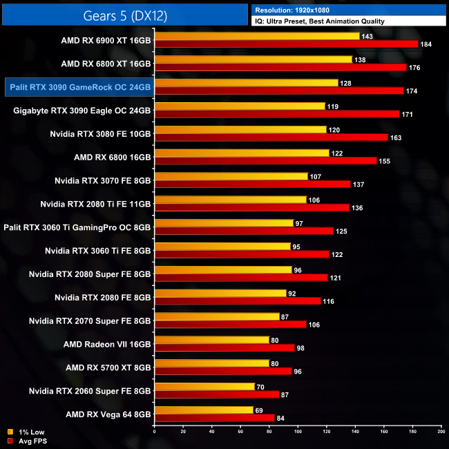 Gears 5 shows more of an improvement for the GameRock OC, as it once more delivered an extra 4% boost to frame rates, when compared to the RTX 3090 Eagle OC. It is also 8% faster than the RX 6900 XT.