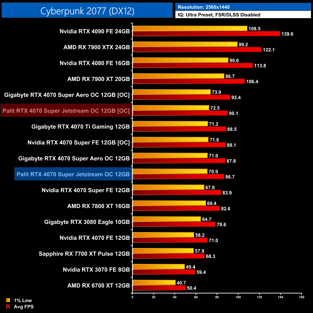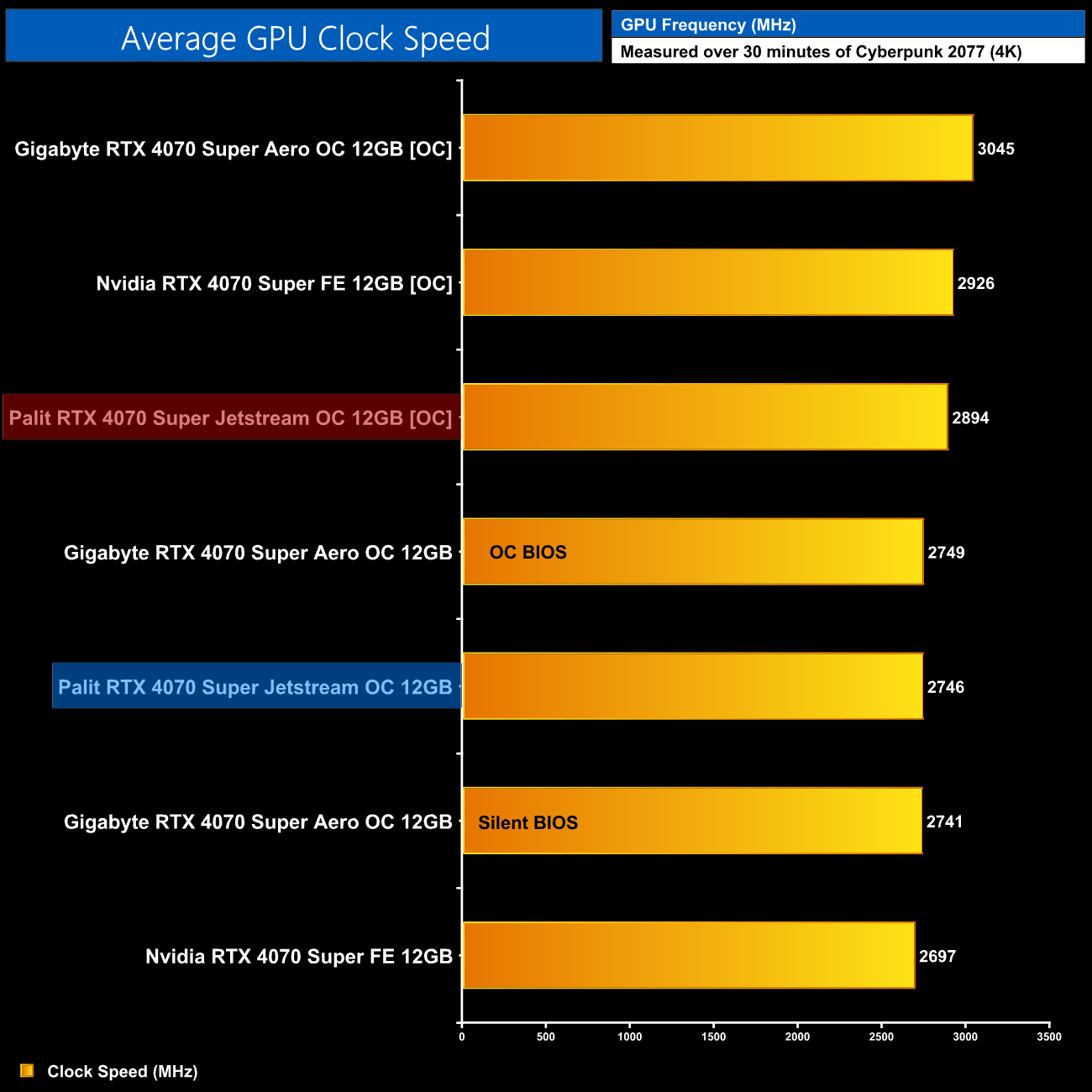 This overclock saw real-world clock speed average 2894MHz, which is slightly slower than what we managed with the Founders and Aero OC cards.