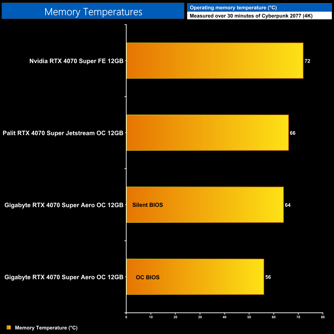 Likewise, the JetStream OC improves on memory temperatures by 6C compared to the Founders Edition, though it can't match the Aero OC for raw performance.