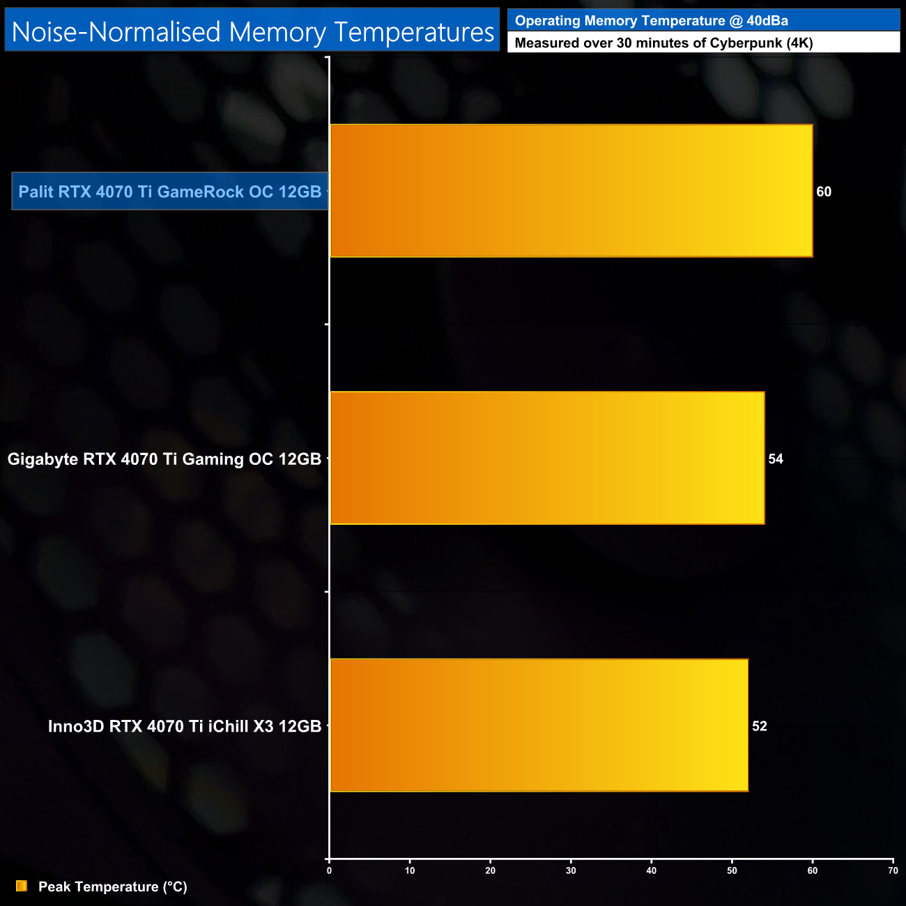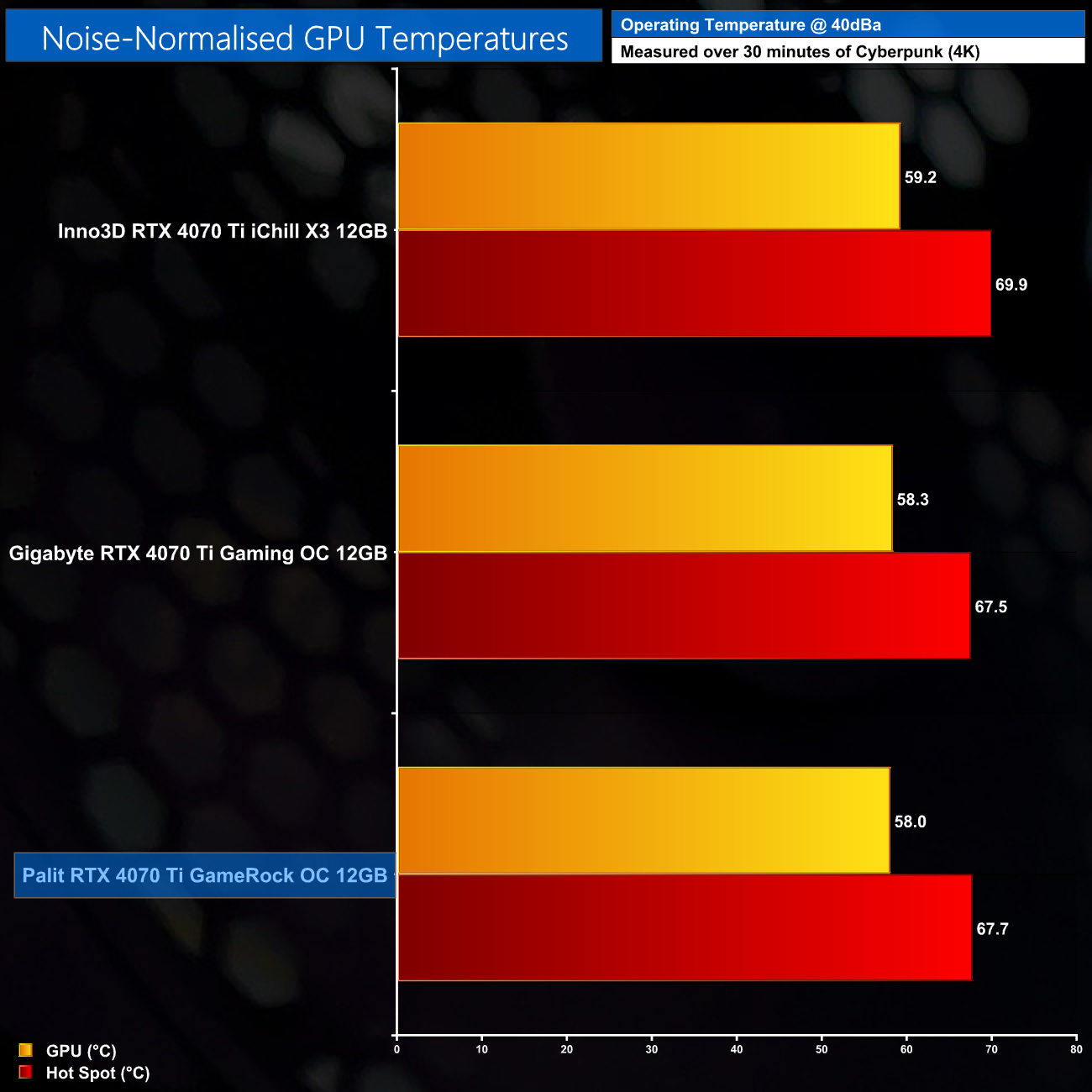 We increase fan speed up to 50%, or 1850rpm, to hit 40dBa, and that saw noise-normalised thermals basically matching the Gigabyte Gaming OC, with a GPU temperature of 58C. All three 4070 Tis are in the same ball park, but clearly the GameRock OC is a very efficient cooler design.