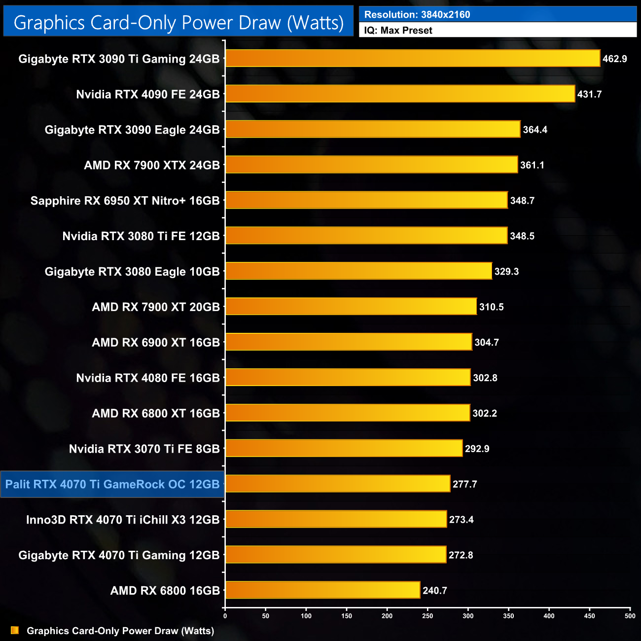 As expected, power draw of the GameRock OC is very similar to the other 4070 Ti's. It is 4W or so higher, possible due to the slight increase in clock speed, but averaging 277W this is very much in the ball park that we'd expect.