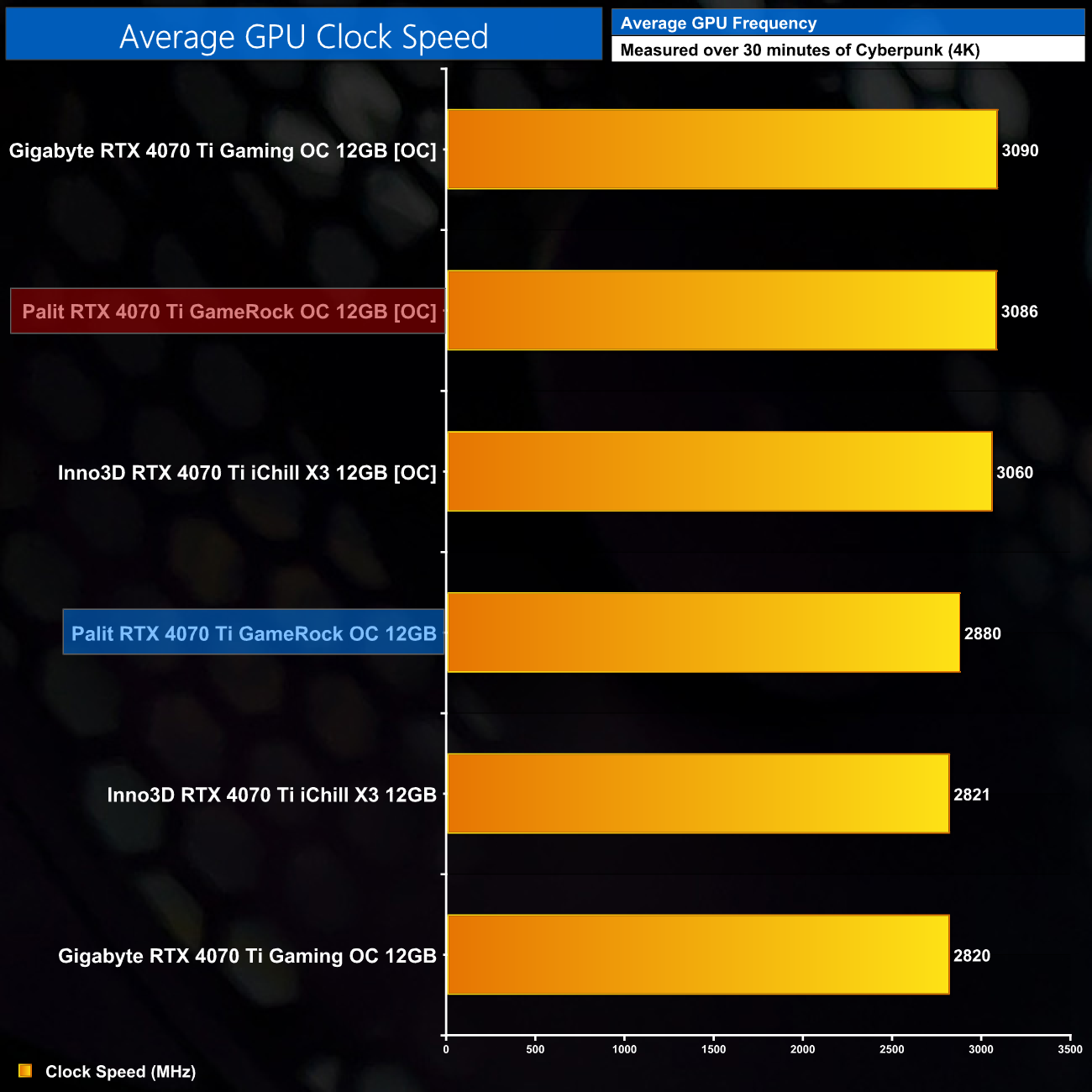 This resulted in a real-world clock speed just shy of 3090MHz, averaging 3086MHz over our thirty minute stress test.