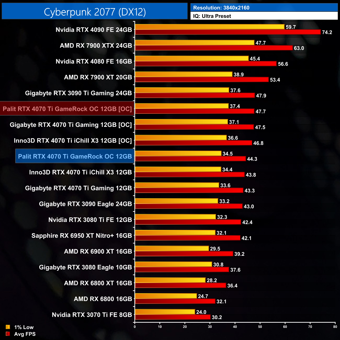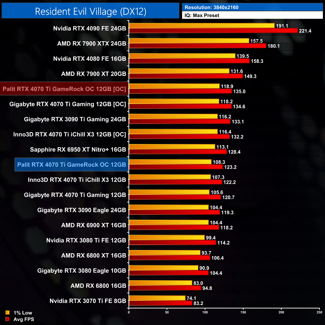This resulted in some significant gains for the GameRock OC, as we gained 8% in Cyberpunk 2077, a rather staggering 12% in Horizon Zero Dawn, and an extra 10% performance in Resident Evil Village.