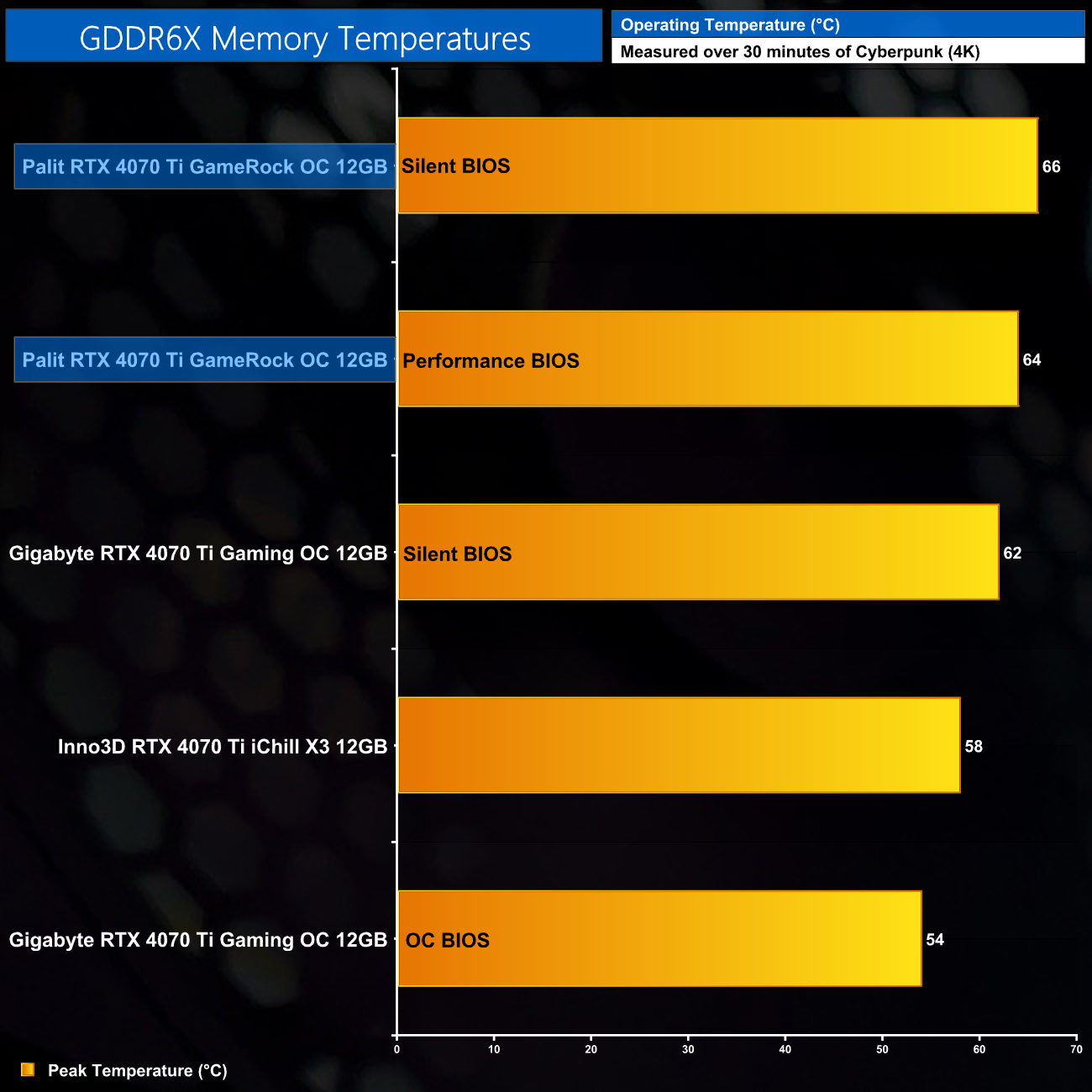 Memory temperatures are also absolutely fine. They are the warmest we've seen yet, but with temperatures of 64C and 66C, it doesn't really matter as this is still very cool for GDDR6X.
