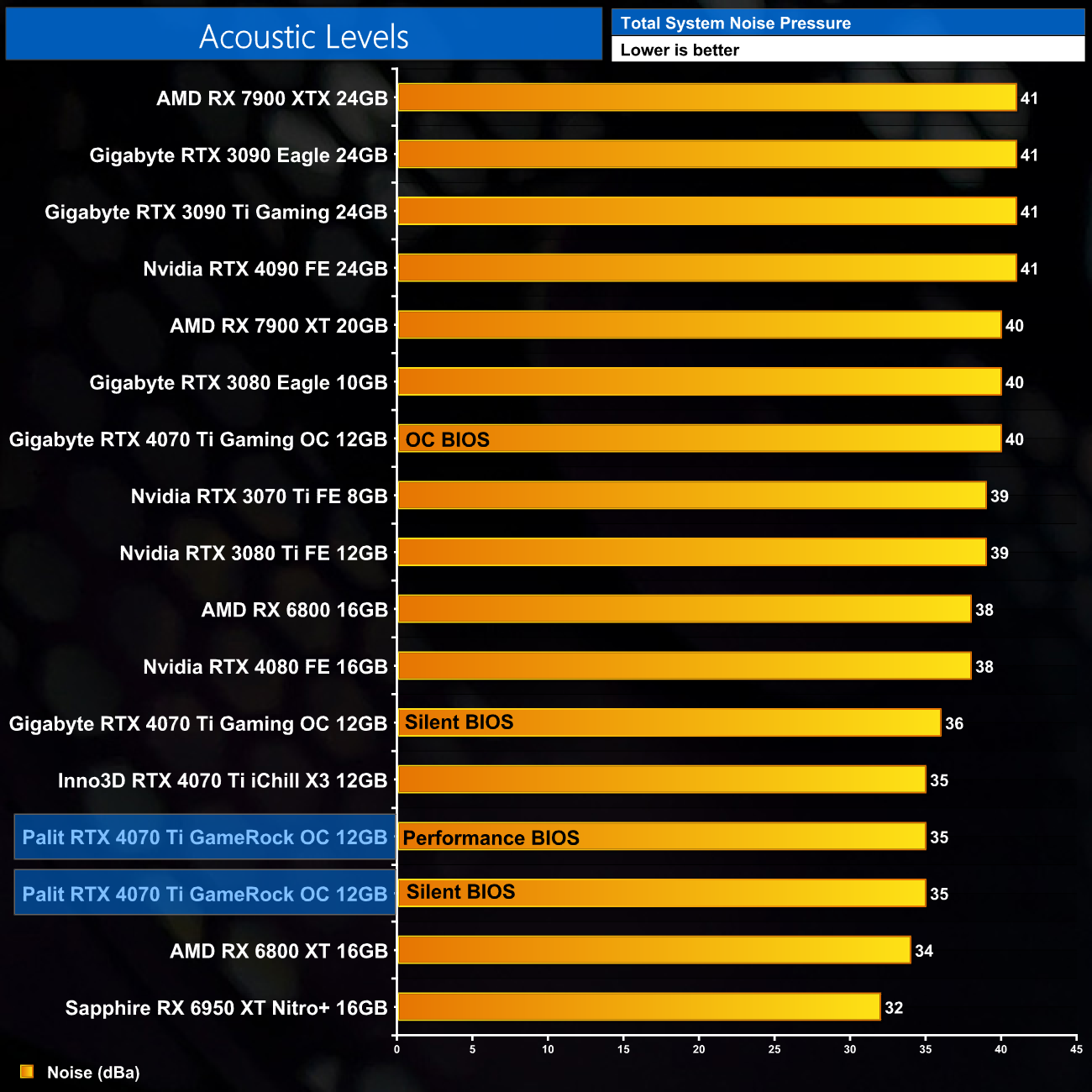 As for noise levels, we already mentioned how similar the Performance and Silent BIOS modes are. As it turns out, we saw the Performance BIOS run the fans just 1% faster under load, with speeds around 1320rpm, compared to 1275rpm when using the Silent BIOS. Such a small difference was imperceptible to my sound meter, but both are still very good results, hitting 35dBa.
