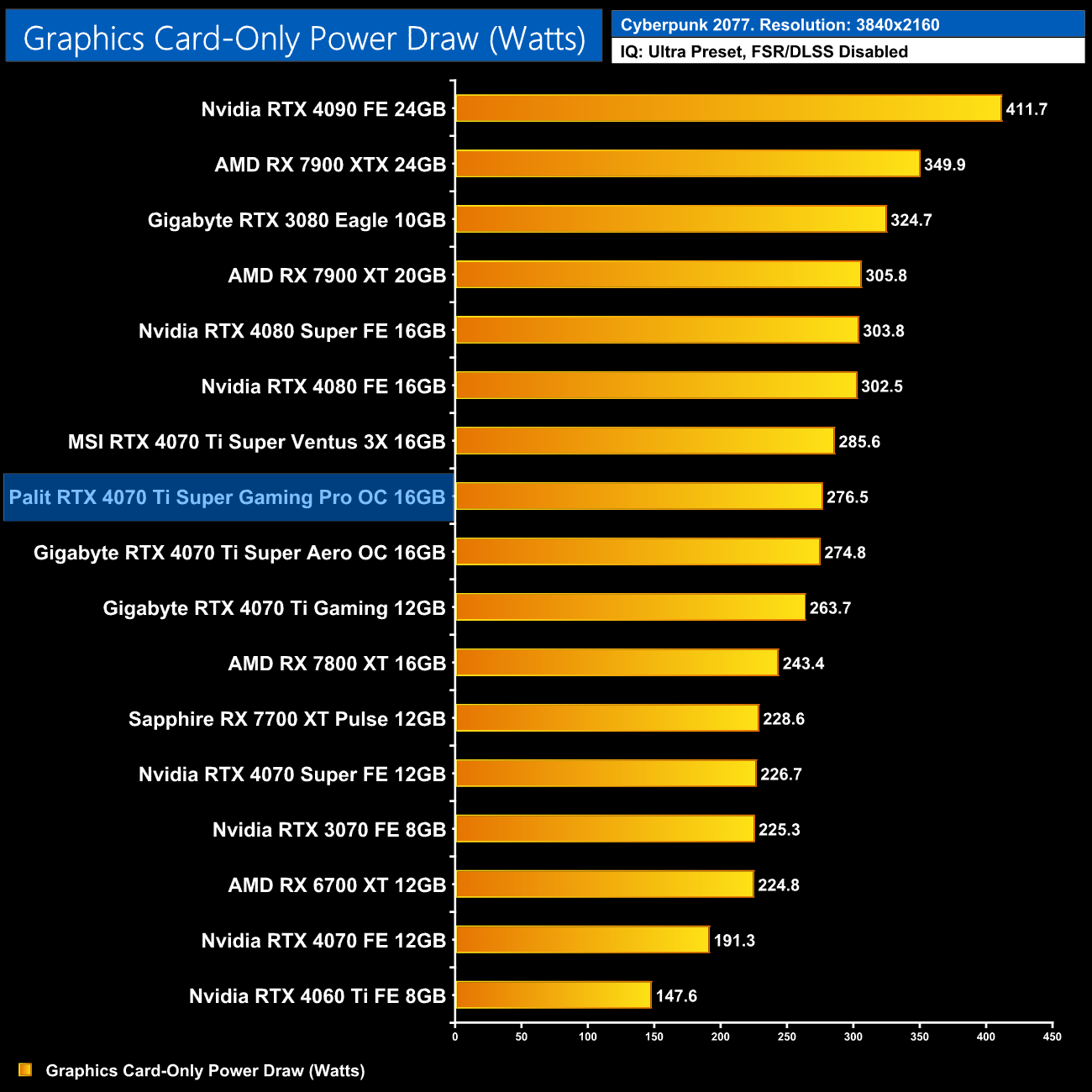 Power draw for the Palit came in a touch below the MSI Ventus 3X, as it hit 276.5W in Cyberpunk 2077 at 4K.