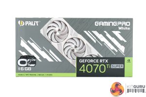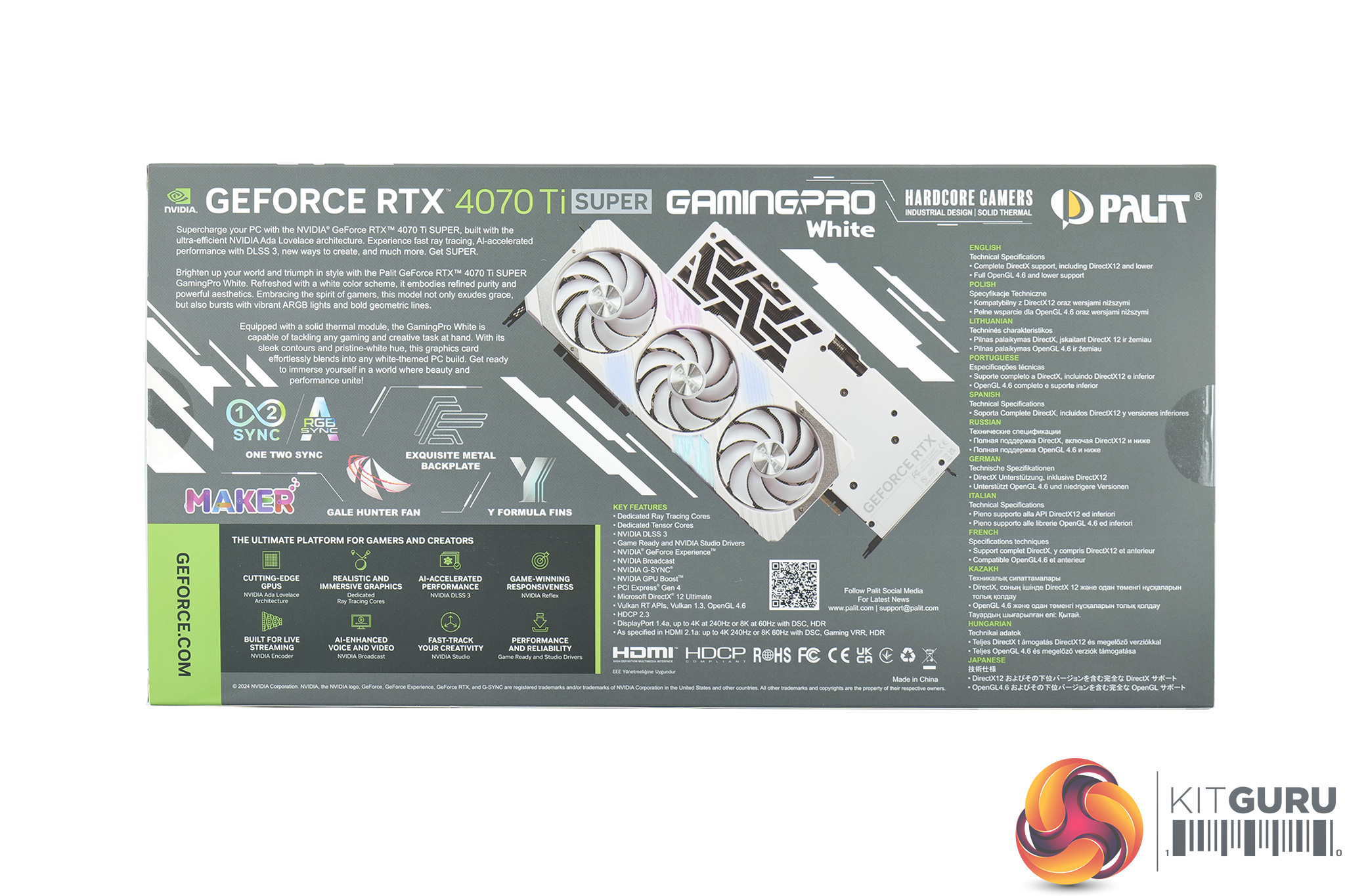 The Palit RTX 4070 Ti Super GamingPro White OC ships in a grey box with an image of the graphics visible on the front, though it is partially obscured by the GeForce RTX branding in the bottom right corner. On the back, Palit highlights various key details of the card and the architecture.