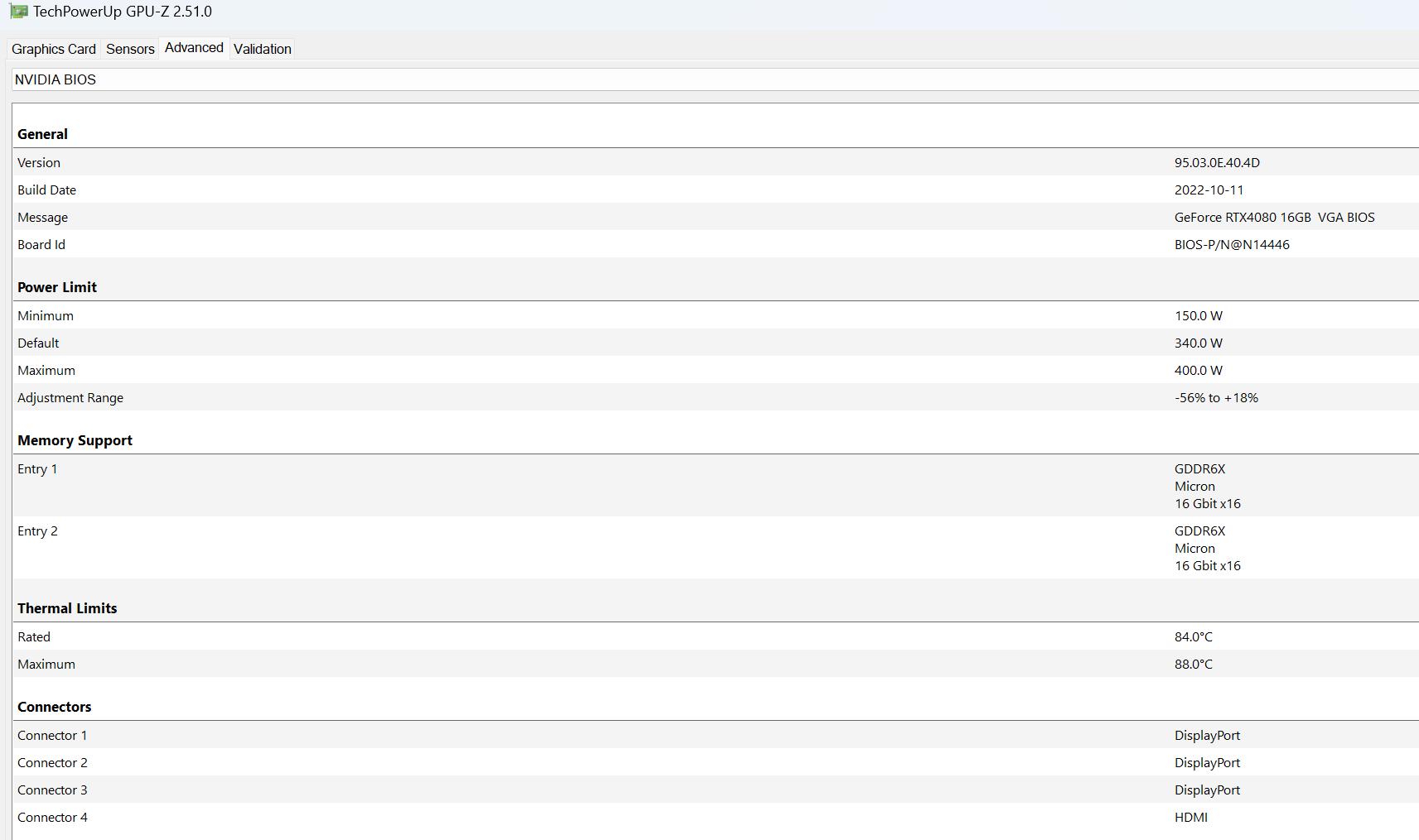 Considering RTX 4080 is notably cut-down versus the RTX 4090, rated power draw is lower, with a 320W TGP. Palit has increased this to 340W for both the Performance BIOS and the Silent BIOS.