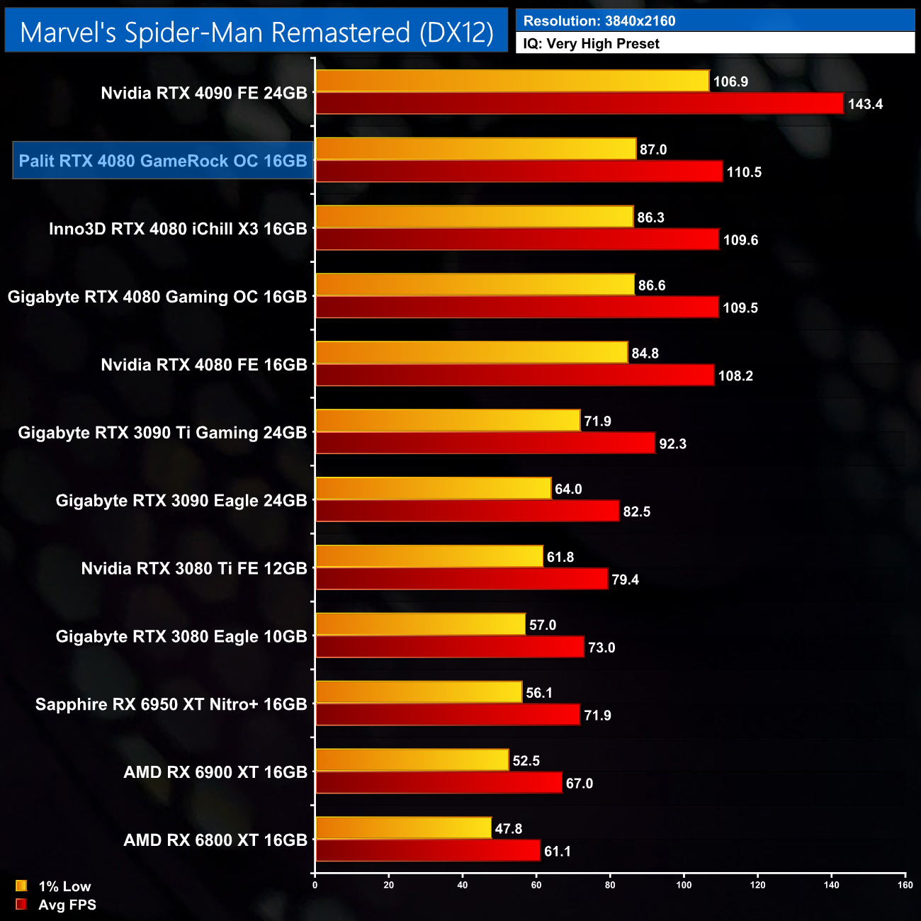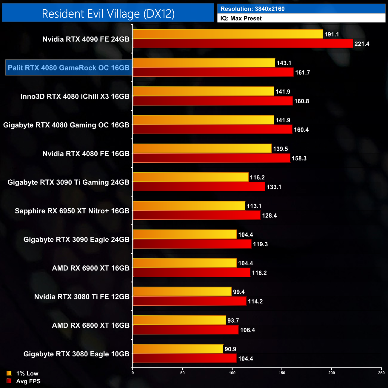 In terms of gaming performance, the GameRock OC did prove to be the fastest-running RTX 4080 we have tested so far. The margins are very slim however, as the GameRock was never more than 3% faster than the Founders Edition – so we're talking differences of just 3-4FPS at most.