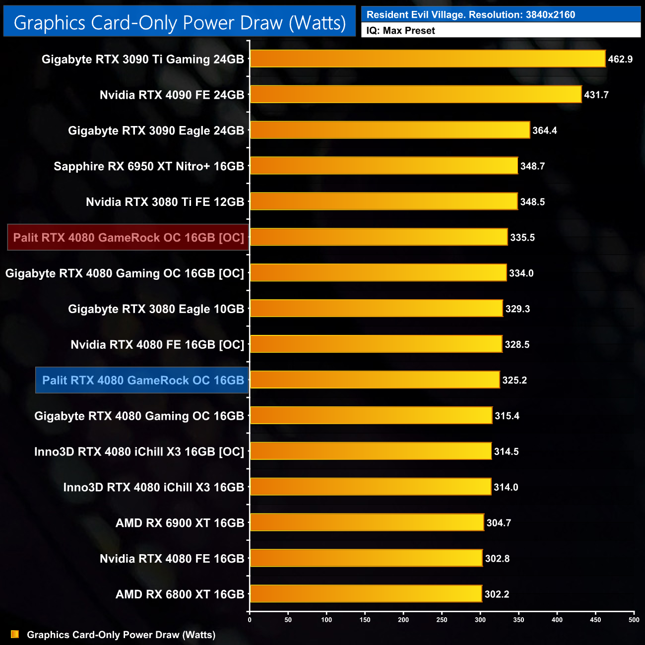 We use Nvidia PCAT to measure power draw of the graphics card only, with readings from both the PCIe slot and the PCIe power cables combined into a single figure. We use Resident Evil Village (4K) for this testing.