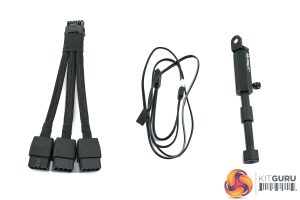 Inside, we find a triple 8-pin power adapter, an ARGB cable used to synchronise the card's RGB lighting with your motherboard, and a height-adjustable GPU support bracket which screws into the side of the card to prevent GPU sag.