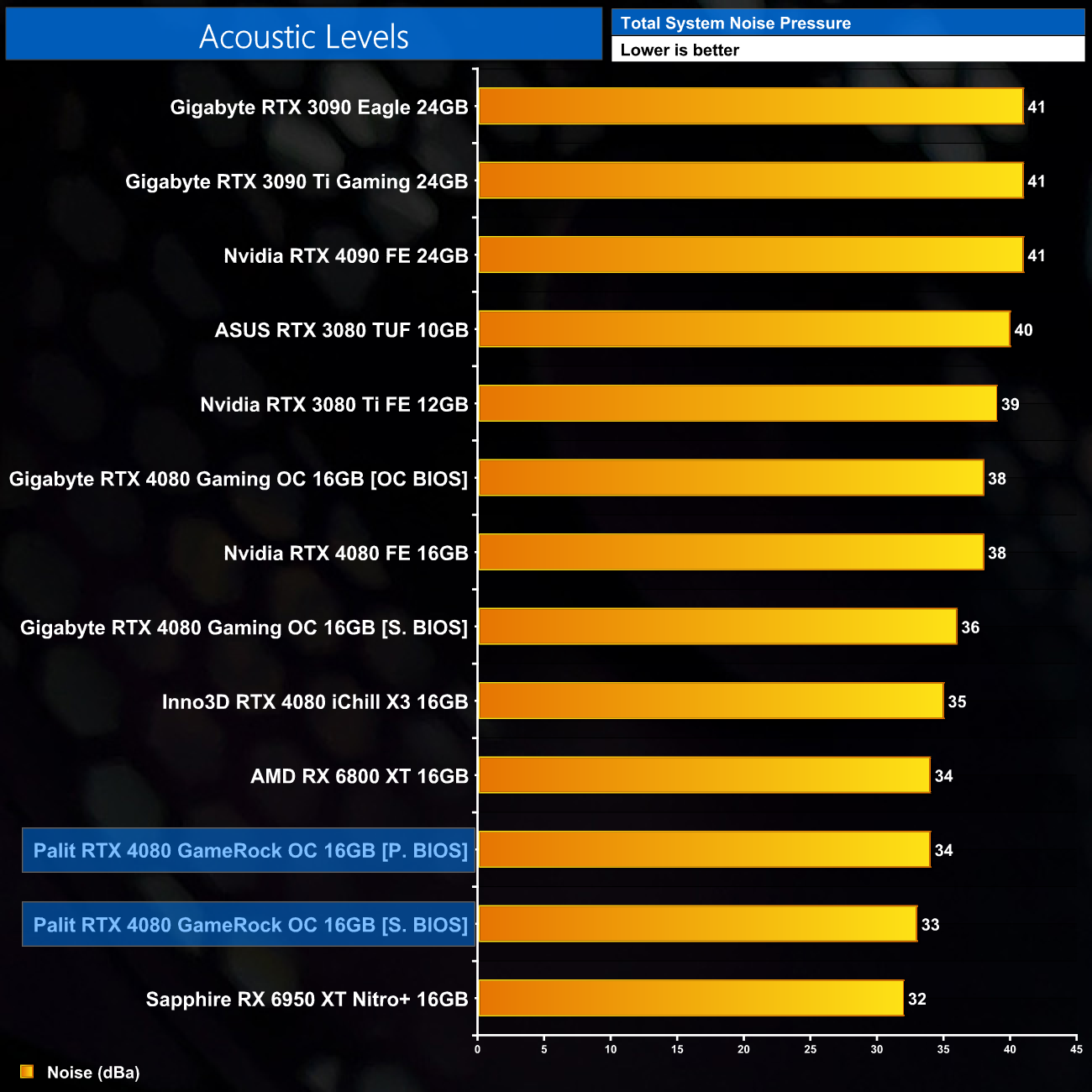 What makes the thermal performance so impressive is the low noise levels at which the GameRock OC operates. Using the Performance BIOS, the fans run at 1390rpm, while the Silent BIOS slowed the fans down to 1290rpm, making it the quietest RTX 4080 we have tested so far.