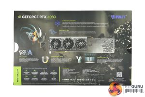 The Palit RTX 4080 GameRock OC ships in a dark box, with an eye-catching crystal-like pattern on the front. On the back, Palit highlights a few key features of the card and the cooler design.
